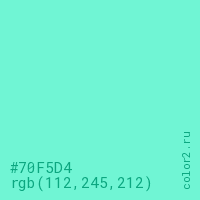 Цвет #70F5D4 в цветовой модели RGB обозначается тремя октетами (112, 245, 212) в десятичном формате и #70F5D4 в шестнадцатиричном (hex) формате, которые являются интенсивностью красного 112 (hex 70), интенсивность зелёного 245 (hex F5) и интенсивность синего 212 (hex D4).
