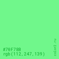 Цвет #70F78B в цветовой модели RGB обозначается тремя октетами (112, 247, 139) в десятичном формате и #70F78B в шестнадцатиричном (hex) формате, которые являются интенсивностью красного 112 (hex 70), интенсивность зелёного 247 (hex F7) и интенсивность синего 139 (hex 8B).