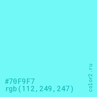 Цвет #70F9F7 в цветовой модели RGB обозначается тремя октетами (112, 249, 247) в десятичном формате и #70F9F7 в шестнадцатиричном (hex) формате, которые являются интенсивностью красного 112 (hex 70), интенсивность зелёного 249 (hex F9) и интенсивность синего 247 (hex F7).