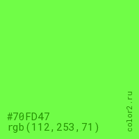 Цвет #70FD47 в цветовой модели RGB обозначается тремя октетами (112, 253, 71) в десятичном формате и #70FD47 в шестнадцатиричном (hex) формате, которые являются интенсивностью красного 112 (hex 70), интенсивность зелёного 253 (hex FD) и интенсивность синего 71 (hex 47).