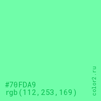 Цвет #70FDA9 в цветовой модели RGB обозначается тремя октетами (112, 253, 169) в десятичном формате и #70FDA9 в шестнадцатиричном (hex) формате, которые являются интенсивностью красного 112 (hex 70), интенсивность зелёного 253 (hex FD) и интенсивность синего 169 (hex A9).