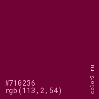 Цвет #710236 в цветовой модели RGB обозначается тремя октетами (113, 2, 54) в десятичном формате и #710236 в шестнадцатиричном (hex) формате, которые являются интенсивностью красного 113 (hex 71), интенсивность зелёного 2 (hex 02) и интенсивность синего 54 (hex 36).
