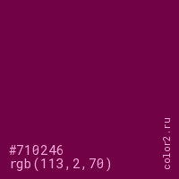 Цвет #710246 в цветовой модели RGB обозначается тремя октетами (113, 2, 70) в десятичном формате и #710246 в шестнадцатиричном (hex) формате, которые являются интенсивностью красного 113 (hex 71), интенсивность зелёного 2 (hex 02) и интенсивность синего 70 (hex 46).