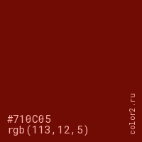Цвет #710C05 в цветовой модели RGB обозначается тремя октетами (113, 12, 5) в десятичном формате и #710C05 в шестнадцатиричном (hex) формате, которые являются интенсивностью красного 113 (hex 71), интенсивность зелёного 12 (hex 0C) и интенсивность синего 5 (hex 05).