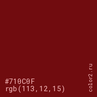 Цвет #710C0F в цветовой модели RGB обозначается тремя октетами (113, 12, 15) в десятичном формате и #710C0F в шестнадцатиричном (hex) формате, которые являются интенсивностью красного 113 (hex 71), интенсивность зелёного 12 (hex 0C) и интенсивность синего 15 (hex 0F).
