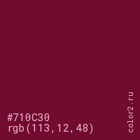 Цвет #710C30 в цветовой модели RGB обозначается тремя октетами (113, 12, 48) в десятичном формате и #710C30 в шестнадцатиричном (hex) формате, которые являются интенсивностью красного 113 (hex 71), интенсивность зелёного 12 (hex 0C) и интенсивность синего 48 (hex 30).