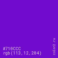 Цвет #710CCC в цветовой модели RGB обозначается тремя октетами (113, 12, 204) в десятичном формате и #710CCC в шестнадцатиричном (hex) формате, которые являются интенсивностью красного 113 (hex 71), интенсивность зелёного 12 (hex 0C) и интенсивность синего 204 (hex CC).