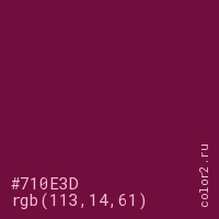 Цвет #710E3D в цветовой модели RGB обозначается тремя октетами (113, 14, 61) в десятичном формате и #710E3D в шестнадцатиричном (hex) формате, которые являются интенсивностью красного 113 (hex 71), интенсивность зелёного 14 (hex 0E) и интенсивность синего 61 (hex 3D).