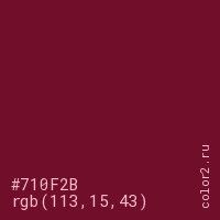 Цвет #710F2B в цветовой модели RGB обозначается тремя октетами (113, 15, 43) в десятичном формате и #710F2B в шестнадцатиричном (hex) формате, которые являются интенсивностью красного 113 (hex 71), интенсивность зелёного 15 (hex 0F) и интенсивность синего 43 (hex 2B).