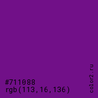 Цвет #711088 в цветовой модели RGB обозначается тремя октетами (113, 16, 136) в десятичном формате и #711088 в шестнадцатиричном (hex) формате, которые являются интенсивностью красного 113 (hex 71), интенсивность зелёного 16 (hex 10) и интенсивность синего 136 (hex 88).