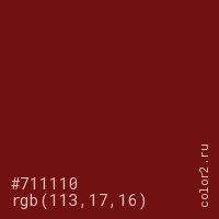 Цвет #711110 в цветовой модели RGB обозначается тремя октетами (113, 17, 16) в десятичном формате и #711110 в шестнадцатиричном (hex) формате, которые являются интенсивностью красного 113 (hex 71), интенсивность зелёного 17 (hex 11) и интенсивность синего 16 (hex 10).