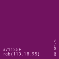 Цвет #71125F в цветовой модели RGB обозначается тремя октетами (113, 18, 95) в десятичном формате и #71125F в шестнадцатиричном (hex) формате, которые являются интенсивностью красного 113 (hex 71), интенсивность зелёного 18 (hex 12) и интенсивность синего 95 (hex 5F).