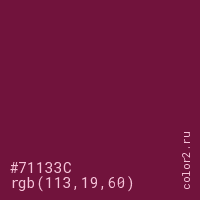 Цвет #71133C в цветовой модели RGB обозначается тремя октетами (113, 19, 60) в десятичном формате и #71133C в шестнадцатиричном (hex) формате, которые являются интенсивностью красного 113 (hex 71), интенсивность зелёного 19 (hex 13) и интенсивность синего 60 (hex 3C).
