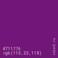 Цвет #711776 в цветовой модели RGB обозначается тремя октетами (113, 23, 118) в десятичном формате и #711776 в шестнадцатиричном (hex) формате, которые являются интенсивностью красного 113 (hex 71), интенсивность зелёного 23 (hex 17) и интенсивность синего 118 (hex 76).
