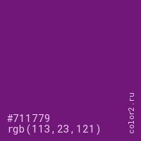 Цвет #711779 в цветовой модели RGB обозначается тремя октетами (113, 23, 121) в десятичном формате и #711779 в шестнадцатиричном (hex) формате, которые являются интенсивностью красного 113 (hex 71), интенсивность зелёного 23 (hex 17) и интенсивность синего 121 (hex 79).