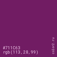 Цвет #711C63 в цветовой модели RGB обозначается тремя октетами (113, 28, 99) в десятичном формате и #711C63 в шестнадцатиричном (hex) формате, которые являются интенсивностью красного 113 (hex 71), интенсивность зелёного 28 (hex 1C) и интенсивность синего 99 (hex 63).