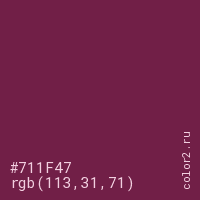 Цвет #711F47 в цветовой модели RGB обозначается тремя октетами (113, 31, 71) в десятичном формате и #711F47 в шестнадцатиричном (hex) формате, которые являются интенсивностью красного 113 (hex 71), интенсивность зелёного 31 (hex 1F) и интенсивность синего 71 (hex 47).