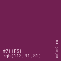 Цвет #711F51 в цветовой модели RGB обозначается тремя октетами (113, 31, 81) в десятичном формате и #711F51 в шестнадцатиричном (hex) формате, которые являются интенсивностью красного 113 (hex 71), интенсивность зелёного 31 (hex 1F) и интенсивность синего 81 (hex 51).