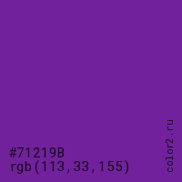 Цвет #71219B в цветовой модели RGB обозначается тремя октетами (113, 33, 155) в десятичном формате и #71219B в шестнадцатиричном (hex) формате, которые являются интенсивностью красного 113 (hex 71), интенсивность зелёного 33 (hex 21) и интенсивность синего 155 (hex 9B).