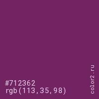 Цвет #712362 в цветовой модели RGB обозначается тремя октетами (113, 35, 98) в десятичном формате и #712362 в шестнадцатиричном (hex) формате, которые являются интенсивностью красного 113 (hex 71), интенсивность зелёного 35 (hex 23) и интенсивность синего 98 (hex 62).