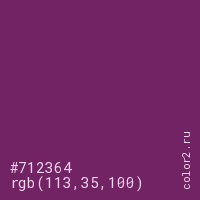 Цвет #712364 в цветовой модели RGB обозначается тремя октетами (113, 35, 100) в десятичном формате и #712364 в шестнадцатиричном (hex) формате, которые являются интенсивностью красного 113 (hex 71), интенсивность зелёного 35 (hex 23) и интенсивность синего 100 (hex 64).