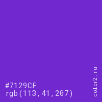 Цвет #7129CF в цветовой модели RGB обозначается тремя октетами (113, 41, 207) в десятичном формате и #7129CF в шестнадцатиричном (hex) формате, которые являются интенсивностью красного 113 (hex 71), интенсивность зелёного 41 (hex 29) и интенсивность синего 207 (hex CF).
