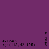 Цвет #712A69 в цветовой модели RGB обозначается тремя октетами (113, 42, 105) в десятичном формате и #712A69 в шестнадцатиричном (hex) формате, которые являются интенсивностью красного 113 (hex 71), интенсивность зелёного 42 (hex 2A) и интенсивность синего 105 (hex 69).