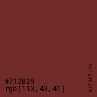 Цвет #712B29 в цветовой модели RGB обозначается тремя октетами (113, 43, 41) в десятичном формате и #712B29 в шестнадцатиричном (hex) формате, которые являются интенсивностью красного 113 (hex 71), интенсивность зелёного 43 (hex 2B) и интенсивность синего 41 (hex 29).