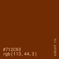 Цвет #712C03 в цветовой модели RGB обозначается тремя октетами (113, 44, 3) в десятичном формате и #712C03 в шестнадцатиричном (hex) формате, которые являются интенсивностью красного 113 (hex 71), интенсивность зелёного 44 (hex 2C) и интенсивность синего 3 (hex 03).