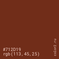 Цвет #712D19 в цветовой модели RGB обозначается тремя октетами (113, 45, 25) в десятичном формате и #712D19 в шестнадцатиричном (hex) формате, которые являются интенсивностью красного 113 (hex 71), интенсивность зелёного 45 (hex 2D) и интенсивность синего 25 (hex 19).