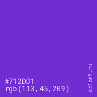 Цвет #712DD1 в цветовой модели RGB обозначается тремя октетами (113, 45, 209) в десятичном формате и #712DD1 в шестнадцатиричном (hex) формате, которые являются интенсивностью красного 113 (hex 71), интенсивность зелёного 45 (hex 2D) и интенсивность синего 209 (hex D1).