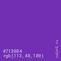 Цвет #7130B4 в цветовой модели RGB обозначается тремя октетами (113, 48, 180) в десятичном формате и #7130B4 в шестнадцатиричном (hex) формате, которые являются интенсивностью красного 113 (hex 71), интенсивность зелёного 48 (hex 30) и интенсивность синего 180 (hex B4).