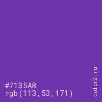 Цвет #7135AB в цветовой модели RGB обозначается тремя октетами (113, 53, 171) в десятичном формате и #7135AB в шестнадцатиричном (hex) формате, которые являются интенсивностью красного 113 (hex 71), интенсивность зелёного 53 (hex 35) и интенсивность синего 171 (hex AB).