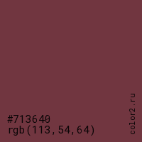 Цвет #713640 в цветовой модели RGB обозначается тремя октетами (113, 54, 64) в десятичном формате и #713640 в шестнадцатиричном (hex) формате, которые являются интенсивностью красного 113 (hex 71), интенсивность зелёного 54 (hex 36) и интенсивность синего 64 (hex 40).