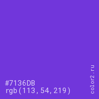 Цвет #7136DB в цветовой модели RGB обозначается тремя октетами (113, 54, 219) в десятичном формате и #7136DB в шестнадцатиричном (hex) формате, которые являются интенсивностью красного 113 (hex 71), интенсивность зелёного 54 (hex 36) и интенсивность синего 219 (hex DB).