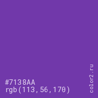 Цвет #7138AA в цветовой модели RGB обозначается тремя октетами (113, 56, 170) в десятичном формате и #7138AA в шестнадцатиричном (hex) формате, которые являются интенсивностью красного 113 (hex 71), интенсивность зелёного 56 (hex 38) и интенсивность синего 170 (hex AA).