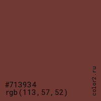 Цвет #713934 в цветовой модели RGB обозначается тремя октетами (113, 57, 52) в десятичном формате и #713934 в шестнадцатиричном (hex) формате, которые являются интенсивностью красного 113 (hex 71), интенсивность зелёного 57 (hex 39) и интенсивность синего 52 (hex 34).