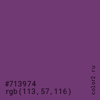 Цвет #713974 в цветовой модели RGB обозначается тремя октетами (113, 57, 116) в десятичном формате и #713974 в шестнадцатиричном (hex) формате, которые являются интенсивностью красного 113 (hex 71), интенсивность зелёного 57 (hex 39) и интенсивность синего 116 (hex 74).