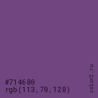 Цвет #714680 в цветовой модели RGB обозначается тремя октетами (113, 70, 128) в десятичном формате и #714680 в шестнадцатиричном (hex) формате, которые являются интенсивностью красного 113 (hex 71), интенсивность зелёного 70 (hex 46) и интенсивность синего 128 (hex 80).