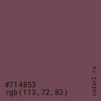 Цвет #714853 в цветовой модели RGB обозначается тремя октетами (113, 72, 83) в десятичном формате и #714853 в шестнадцатиричном (hex) формате, которые являются интенсивностью красного 113 (hex 71), интенсивность зелёного 72 (hex 48) и интенсивность синего 83 (hex 53).