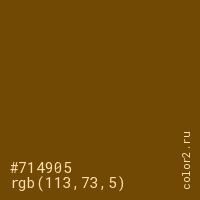 Цвет #714905 в цветовой модели RGB обозначается тремя октетами (113, 73, 5) в десятичном формате и #714905 в шестнадцатиричном (hex) формате, которые являются интенсивностью красного 113 (hex 71), интенсивность зелёного 73 (hex 49) и интенсивность синего 5 (hex 05).