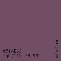 Цвет #714E63 в цветовой модели RGB обозначается тремя октетами (113, 78, 99) в десятичном формате и #714E63 в шестнадцатиричном (hex) формате, которые являются интенсивностью красного 113 (hex 71), интенсивность зелёного 78 (hex 4E) и интенсивность синего 99 (hex 63).