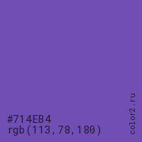 Цвет #714EB4 в цветовой модели RGB обозначается тремя октетами (113, 78, 180) в десятичном формате и #714EB4 в шестнадцатиричном (hex) формате, которые являются интенсивностью красного 113 (hex 71), интенсивность зелёного 78 (hex 4E) и интенсивность синего 180 (hex B4).