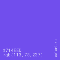 Цвет #714EED в цветовой модели RGB обозначается тремя октетами (113, 78, 237) в десятичном формате и #714EED в шестнадцатиричном (hex) формате, которые являются интенсивностью красного 113 (hex 71), интенсивность зелёного 78 (hex 4E) и интенсивность синего 237 (hex ED).