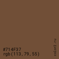 Цвет #714F37 в цветовой модели RGB обозначается тремя октетами (113, 79, 55) в десятичном формате и #714F37 в шестнадцатиричном (hex) формате, которые являются интенсивностью красного 113 (hex 71), интенсивность зелёного 79 (hex 4F) и интенсивность синего 55 (hex 37).
