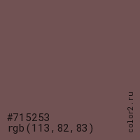 Цвет #715253 в цветовой модели RGB обозначается тремя октетами (113, 82, 83) в десятичном формате и #715253 в шестнадцатиричном (hex) формате, которые являются интенсивностью красного 113 (hex 71), интенсивность зелёного 82 (hex 52) и интенсивность синего 83 (hex 53).
