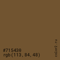 Цвет #715430 в цветовой модели RGB обозначается тремя октетами (113, 84, 48) в десятичном формате и #715430 в шестнадцатиричном (hex) формате, которые являются интенсивностью красного 113 (hex 71), интенсивность зелёного 84 (hex 54) и интенсивность синего 48 (hex 30).