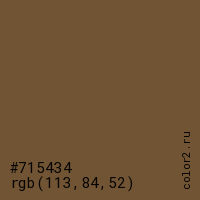 Цвет #715434 в цветовой модели RGB обозначается тремя октетами (113, 84, 52) в десятичном формате и #715434 в шестнадцатиричном (hex) формате, которые являются интенсивностью красного 113 (hex 71), интенсивность зелёного 84 (hex 54) и интенсивность синего 52 (hex 34).