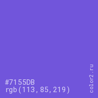 Цвет #7155DB в цветовой модели RGB обозначается тремя октетами (113, 85, 219) в десятичном формате и #7155DB в шестнадцатиричном (hex) формате, которые являются интенсивностью красного 113 (hex 71), интенсивность зелёного 85 (hex 55) и интенсивность синего 219 (hex DB).