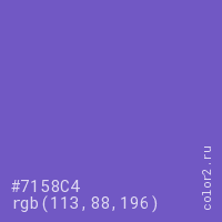 Цвет #7158C4 в цветовой модели RGB обозначается тремя октетами (113, 88, 196) в десятичном формате и #7158C4 в шестнадцатиричном (hex) формате, которые являются интенсивностью красного 113 (hex 71), интенсивность зелёного 88 (hex 58) и интенсивность синего 196 (hex C4).